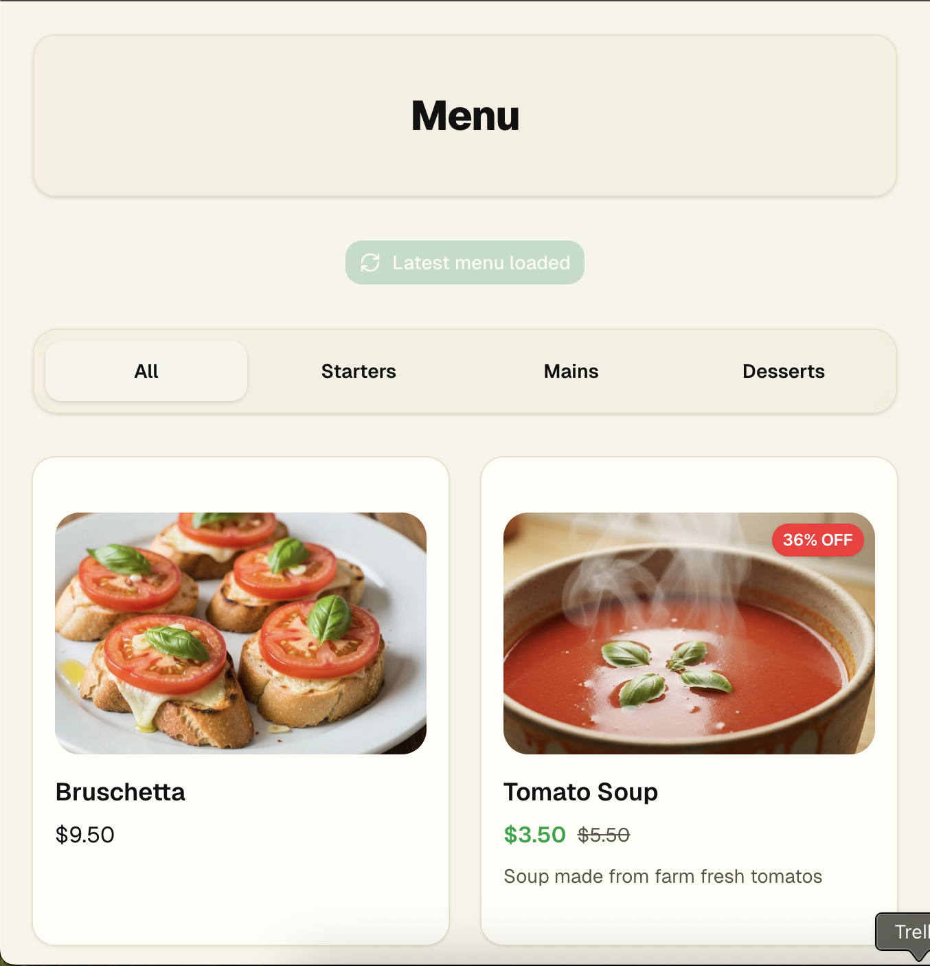 A Full Stack application build as an online restaurant menu with an Admin Panel to manage and update the menu as per needed. Scanning the QR code redirects users to a sleek menu interface which seamlessly updates in realtime if an admin pushing an update to the menu from the admin interface.